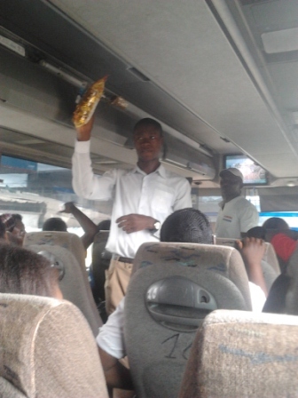 Une fois dans le car, ce sont des vendeurs qui vous servent d’hôtesses et vous accueillent, à l’introduction ils vous distribuent des bonbons gratuitement et vous demandent de les gouter pour ensuite les apprécier et enfin acheter. Voici ce que j’entends « bonjour tout le monde, papa, maman, je vois que personne ne répond, je vais vous faire un petit cadeau. Chacun de vous à droit à un bonbon ». (À ce moment, il n’y a que les enfants qui se concentrent et deviennent excités). « Goûtez goûtez, c’est gratuit, les bonbons qui donnent la chaleur au cœur » (il passe à la distribution à chaque rangée de siège, à ce moment ce sont les adultes qui sont devenus incontrôlables et certains souriants). « Ce sont les bonbons fa fa na na nanfang chinchotouen, hing hong »et là tout les passagers éclatent de rire. Il a gagné avec ça car tout le monde veut de ses bonbons de 3 paquets à 500F, il y a tellement de clients qu’il manque de monnaie et d’emballages. A peine il descend que c’est au tour de l’intello de se pointer. Il a un tas de livres dans ces deux mains qu’il présente à tout le monde du nouveau code de procédure pénale en passant par les démarches administratives à la retraire, etc, il ne séduit que deux clients et n’est pas très content. Après lui, le défilé s’arrête et tout semble calme jusqu’à l’arrivée de Sango Pasto.
